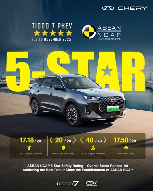 在成人乘员保护(满分40.00分)和安全辅助(满分20.00分)两大关键评测中均以满分通过,成为目前唯一实现“双满分”的插混车型。同时,在儿童乘员保护方面拿下17.18分,在摩托车安全保护层面也取得了17.50分的优异成绩,充分彰显奇瑞瑞虎领先的安全实力,为中国汽车品牌在东南亚市场树立了全新的安全标杆。这是瑞虎7在先后揽获C-NCAP、ANCAP以及Euro NCAP三项五星安全认证后,再度将全球顶级安全评价的第四项五星收入囊中。至此,瑞虎7成为中国汽车品牌中唯一占据四项“安全大满贯”战绩的车型。
